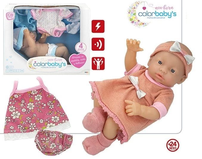 Bambolotto con suoni Realistici e tanti Accessori inclusi, La Bambola è snodata, con versi di Bebè è alta 25cm. Batterie Incluse, età consigliata +24 Mesi. Due Modelli In Assortimento Maschietto o Femminuccia.