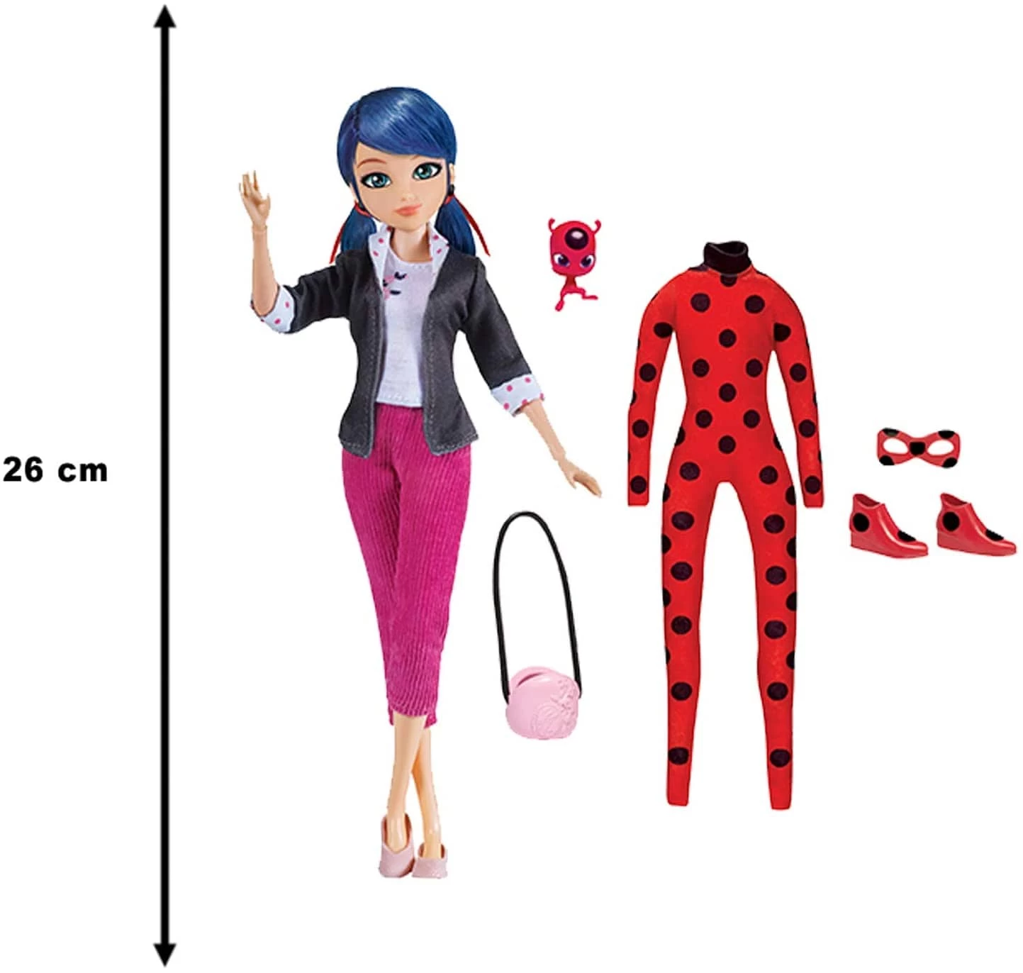 Miraculous Ladybug Bambola Marinette più Trasformazione, Marinette tiene al sicuro il suo segreto e si trasforma in Ladybug solo quando Parigi è in pericolo! Il set viene fornito con una bambola Marinette, due abiti alla moda, Kwami “TIkki”, il suo Yo-Yo firmato, stivaletti Ladybug, i suoi orecchini Miraculous e una maschera segreta Ladybug rimovibile. Ci sono 13 punti di articolazione nella bambola per una super giocabilità!