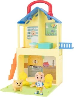 Cocomelon Casa Pop Up Playset, preparati per un divertimento melodioso con il playset casetta di CoComelon! È ora di giocare con il playset Pop n’ Play House di Cocomelon! Apri il playset per rivelare la casa a 2 piani di Cocomelon piena di divertenti sorprese! Spingi giù la casa quando il tempo di gioco è finito e riponi tutti i pezzi all’interno per giocare in dove vuoi!. Il Playset House è richiudibile e può essere facilmente trasportato tramite la maniglia. +3Anni