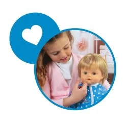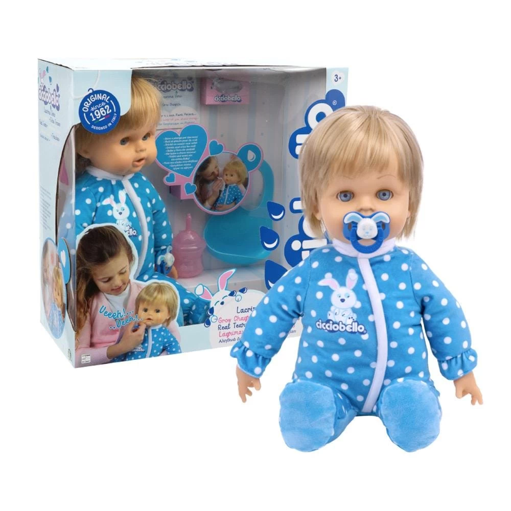 Ciccio Bello Lacrime Vere Ha bisogno di molte Attenzioni, chiama la Mamma con teneri versetti. Quando il Bambolotto mette il broncio i suoi occhioni blu si riempiono di lacrime e inizia a piangere Veramente! Cicciobello muove realmente la bocca sia quando piange che quando succhia il biberon, apre e chiude gli occhi e dopo aver bevuto digerisce emettendo un simpatico ruttino. Bambolotto interattivo da Giochi Preziosi