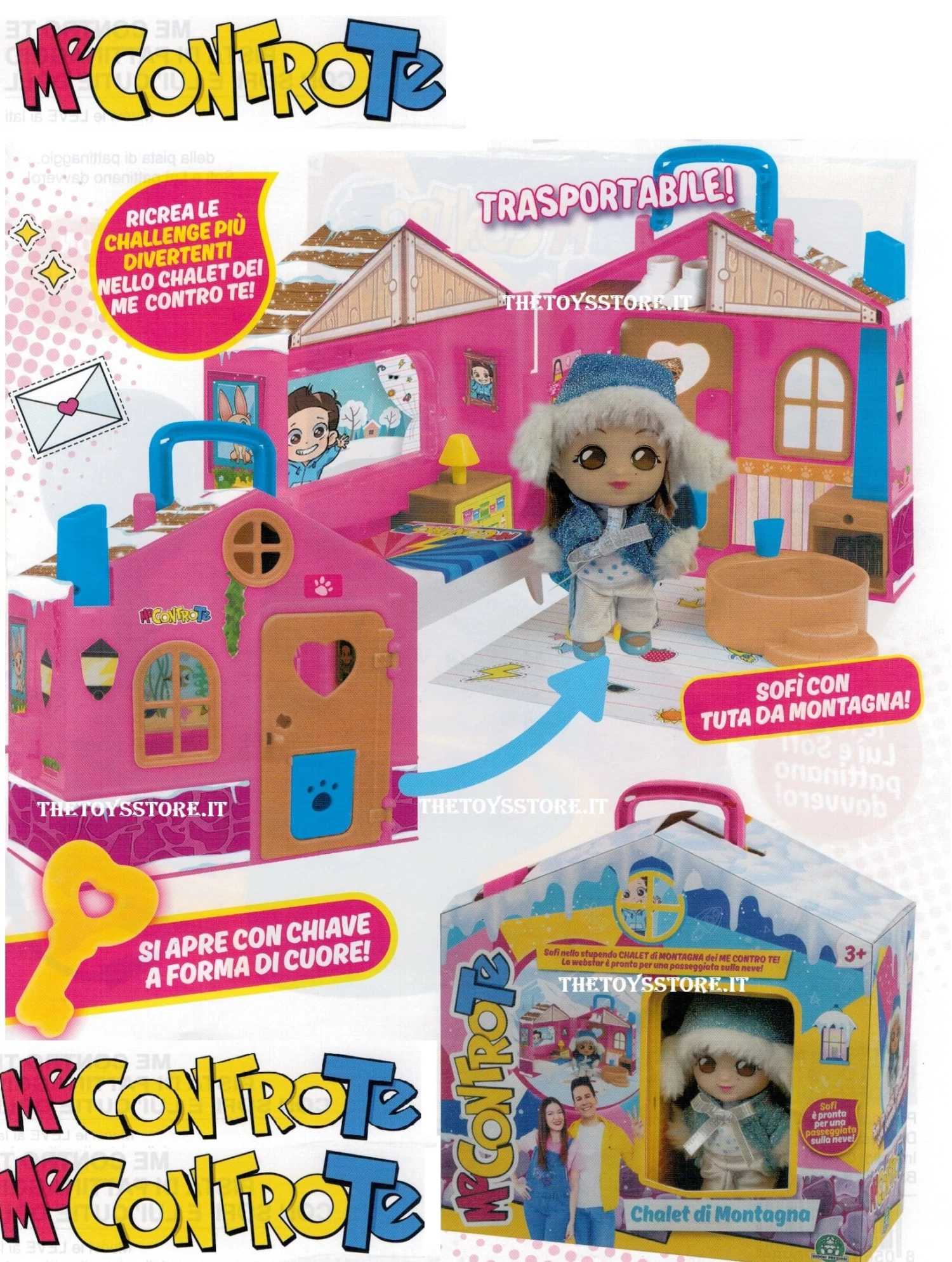 Me contro Te casa in Montagna con Sofì cutie doll, elegante Chalet apribile che rivela un playset da gioco e include la Bambola Sofi. Il set da gioco può essere aperto con la chiave a forma di cuore (in dotazione), la doll è vestita con tuta da montagna.