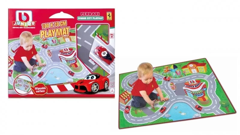 Bburago Junior, Tappeto Stradale con Automobile Ferrari +12 Mesi. Fantastico tappeto in Tessuto non Tessuto con stampa di percorso stradale, include veicolo a ruota libera La Ferrari. Dimensioni 100x70cm, lavabile in lavatrice. +12Mesi