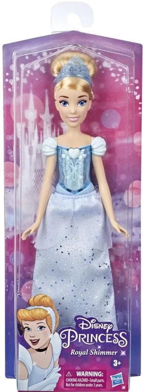 Nuove Bambole Disney princess Royal Shimmer, le principesse Brillano con Nuovi Abiti. Cenerentola indossa un Abito Blu ed ha dei lunghi capelli biondi, la Bambola porta una corona abbinata con il suo vestito Reale. Età Consigliata +3 Anni.