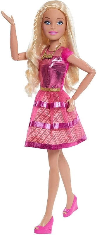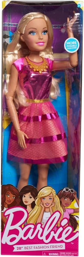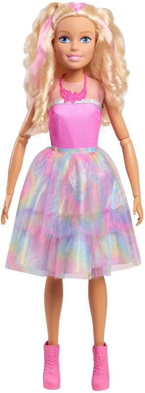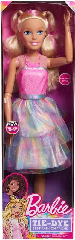 Barbie Bambola Gigante, alta più di 70cm, Barbie migliore amica di moda non è mai stata più bella o Fashion! La bambola articolata è stupenda nel suo vestito con un corpetto rosa scintillante, gonna a strati in tulle scintillante metallizzato e tie-dye e scarpe rosa rimovibili. Una versione extra della bambola mattel, con lunghi capelli Biondi con ciocche colorate. Età 3+