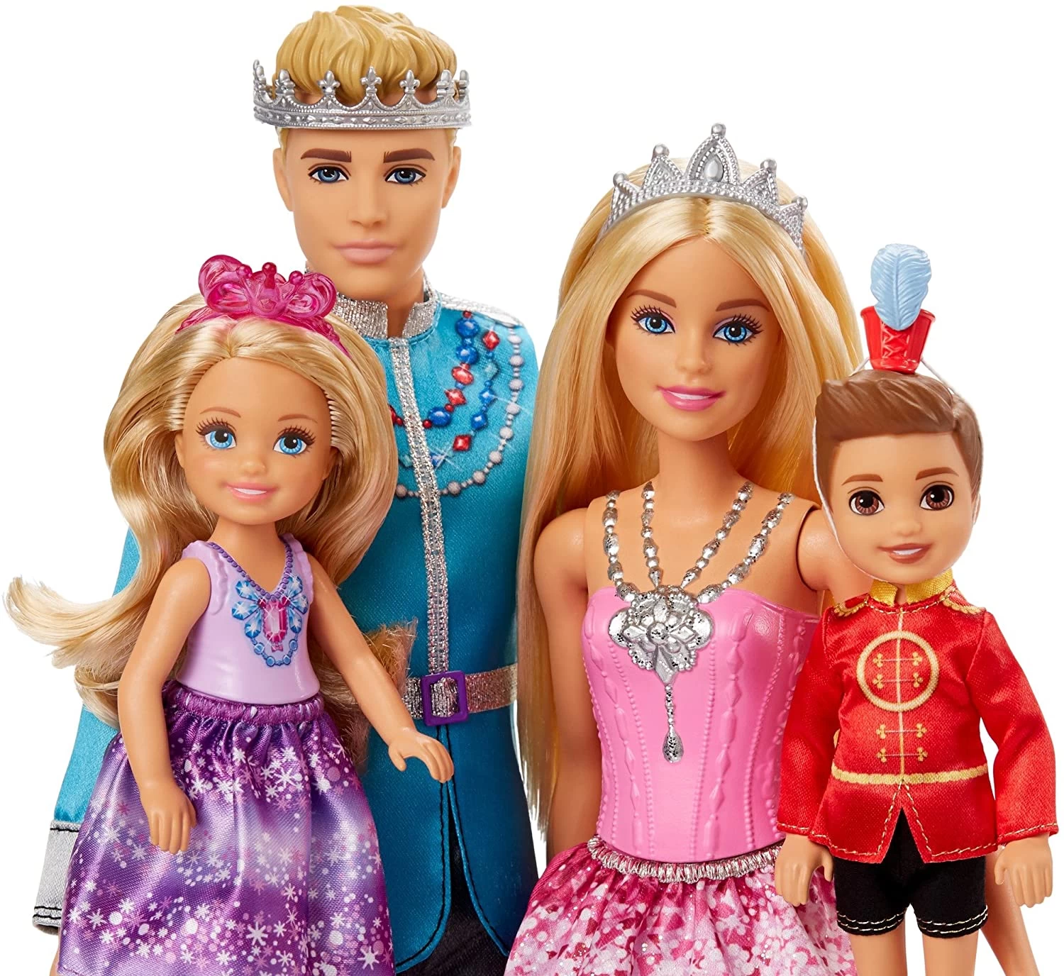 Tutta la Famiglia reale al completo, La principessa Dreamtopia Barbie, Il principe Ken, Chelsea ed il Fratellino Notto. Ogni bambola è vestita con abiti reali, ispirato al Regno delle gemme Dreamtopia. Tantissimi accessori speciali come la corona d’argento, un cappello con piuma. Con questo set i bambini stimolano le loro fantasie e potranno creare storie di ogni genere.
