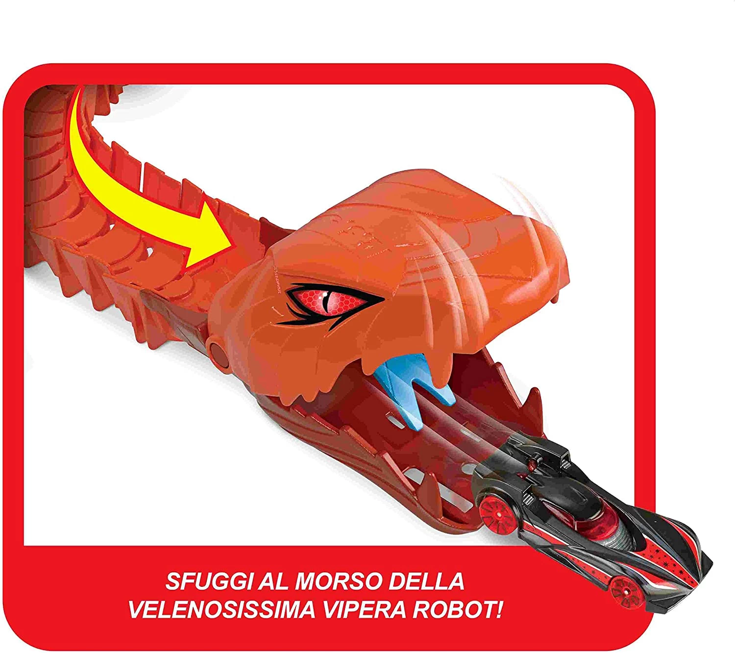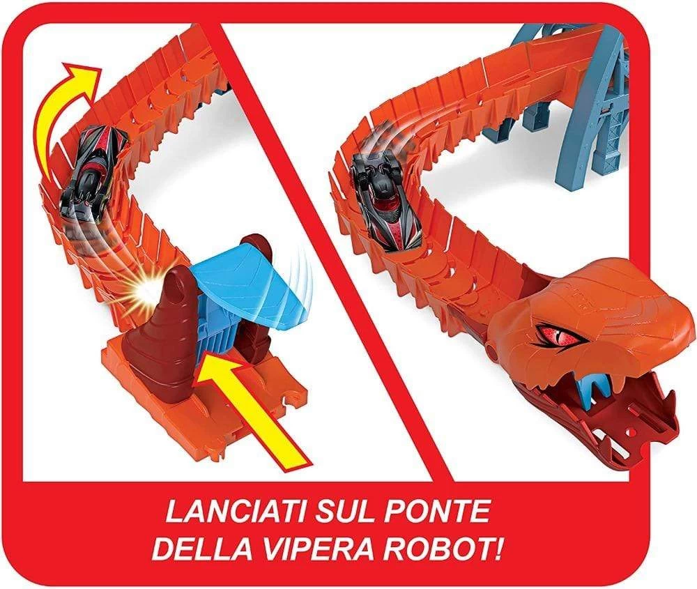 Pista Hot Wheels Vipera Robot, grande set con Auto in Metallo e lanciatore. Sfuggi alla Creatura Mostruosa passando dal Ponte, ma attento al suo Morso Velenoso! Fantastico set da gioco per Bambini a partire dai 4 Anni di Età, ciascun bambino lancia un’automobile lungo il percorso Ponte della Vipera. Compatibile con altri set Hot wheels City. Include 1 veicolo.