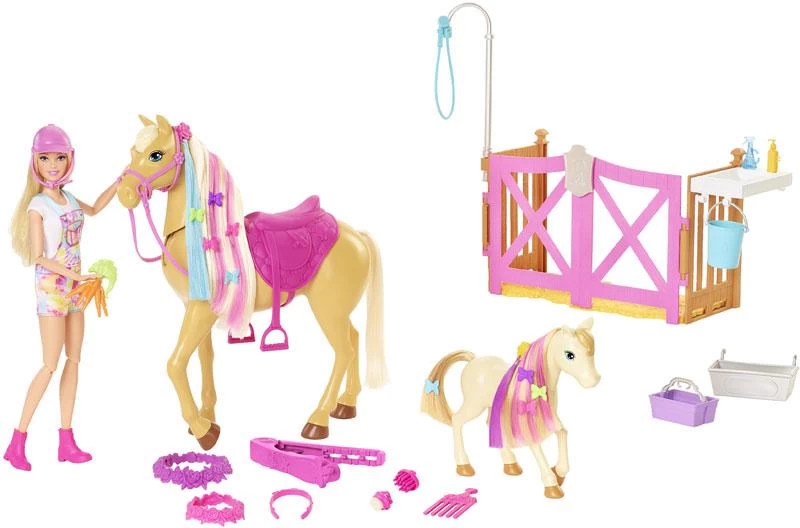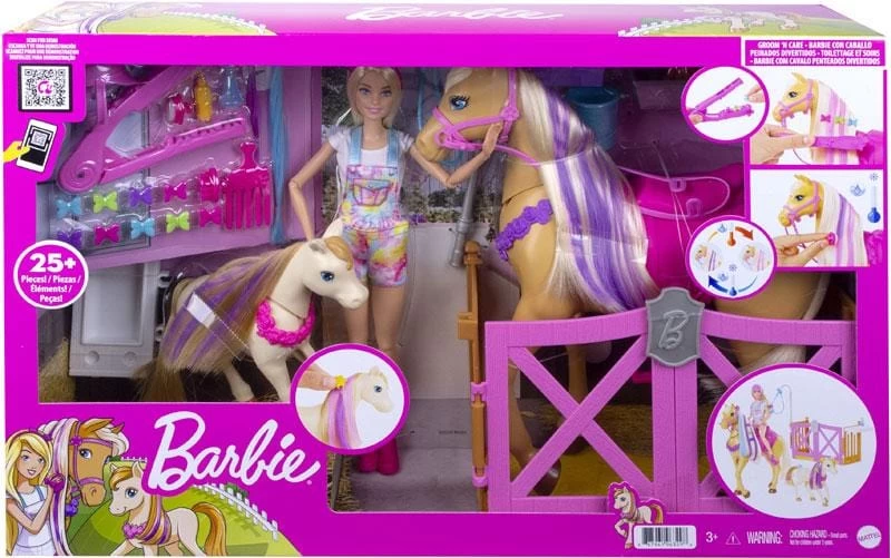 Il Ranch Di Barbie, Bambola con Cavalli e 20 Accessori. Il ranch di barbie ispira la cura, lo styling e il divertimento dell’amicizia con la bambola Barbie, due cavalli e tantissimi accessori! Il playset include una recinzione con trogolo, doccia e postazione per lo styling dove Barbie può accudire i suoi cavalli. Spazzola le criniere di entrambi gli animali, quindi usa l’acqua ghiacciata per rivelare striature colorate! Usa acqua calda per invertire il cambiamento di colore e ripeti ancora e ancora. Aggiungi un accessorio per l’estensione dei capelli o una corona di fiori, quindi carica lo speciale strumento per lo styling e premi sulle criniere dei cavalli o sui capelli della bambola Barbie per applicare adorabili fermagli a farfalla. Quando i bambini hanno completato l’acconciatura dei Cavalli, possono aiutare la bambola Barbie® a dare ai suoi animali domestici uno spuntino a base di carote: entrambe le teste dei cavalli possono andare su e giù per un dolce momento snack. Infine, piega le ginocchia di Barbie e mettila sulla sella del cavallo più grande per fare un giro. Con la bambola Barbie, due cavalli e oltre 20 pezzi a tema, le possibilità di gioco sono infinite! Età raccomandata +3 Anni.