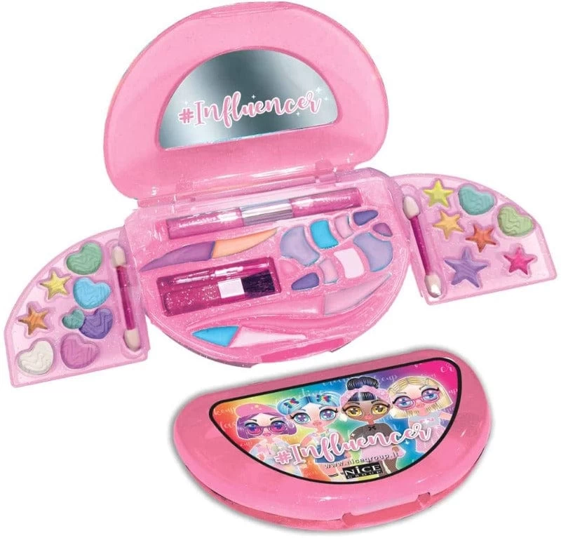 Influencer Trousse per Bambine Make Up, fantastico set trucchi che include tutto l’occorrente per un trucco perfetto! La nuova linea di Cosmetici per Bambine di Nice è adatto a pelli sensibili ed è prodotta nel rispetto della Natura. Questa preziosa Trousse con specchio e vassoi ad apertura laterale, contiene un’ampia gamma di ombretti, blush, lipgloss, applicatori. Il set include anche uno smalto in base d’acqua, una lima per unghie e gemme adesive. Senza Parabeni.