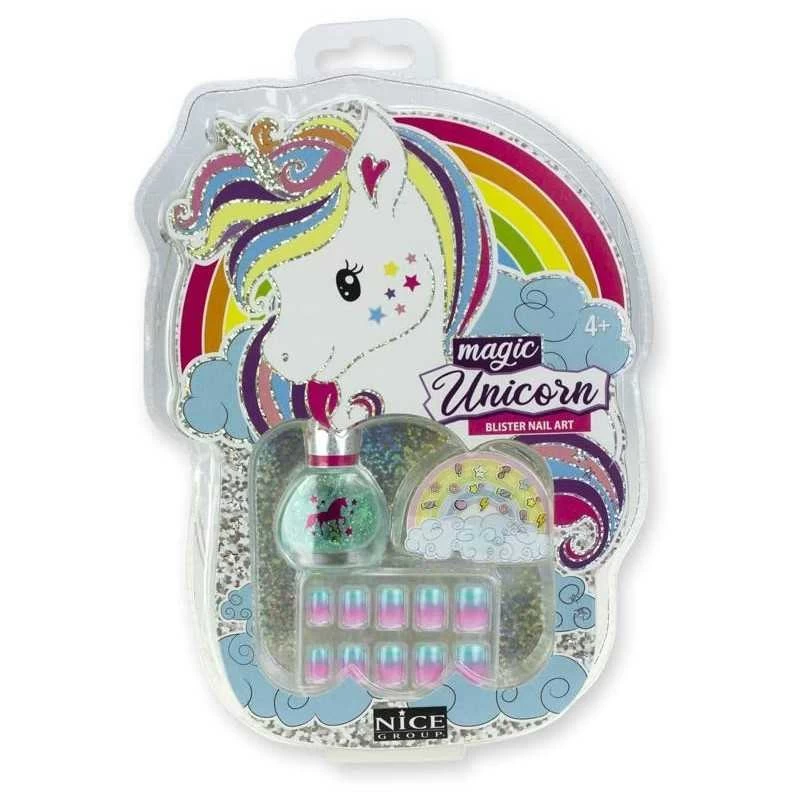 Nice Magic Unicorn set Decoro Unghie Unicorno per Bambine, fantastico kit in blister che incluse smalto a base di acqua, unghie press on, adesivi. Tutto adatto per le pelli sensibili dei più piccoli. Rimuovere smalto con acqua e sapone, non utilizzare solventi. Per rimuovere le press on nails lasciare le mani in acqua tiepida per qualche minuto.