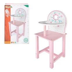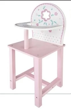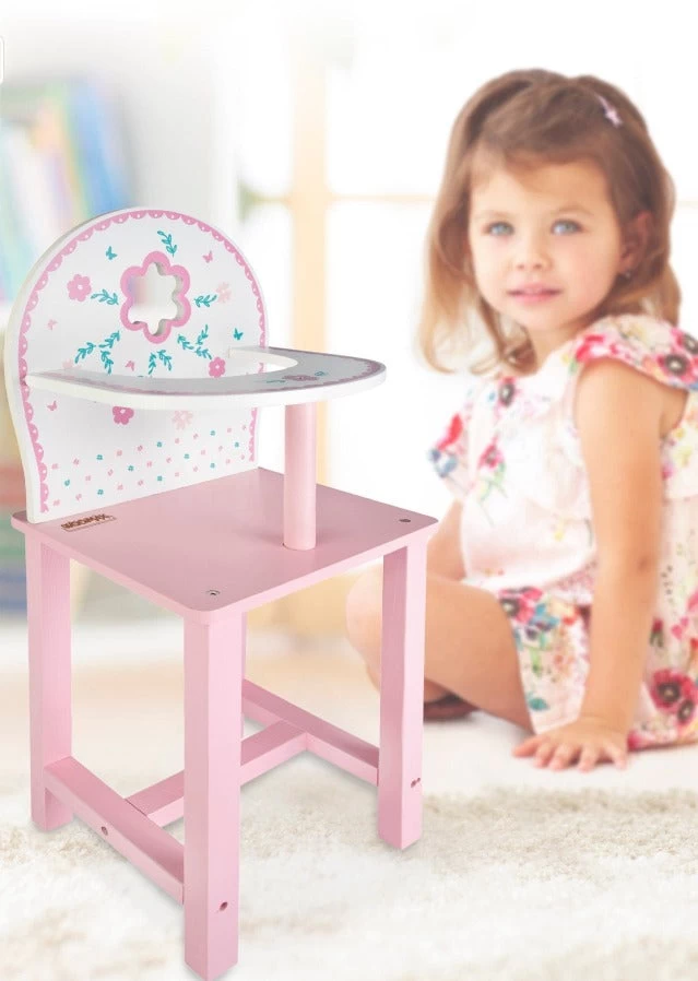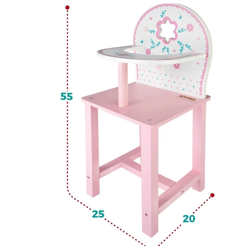 Seggiolone in Legno per Bambole, elegante Sedia Pappa Giocattolo, compatibile con Tutte le Bambole da 35cm in Su. Sedia in legno per Bambolotti, Colori delicati e Decori di Qualità. Prodotto Certificato e Sicuro.