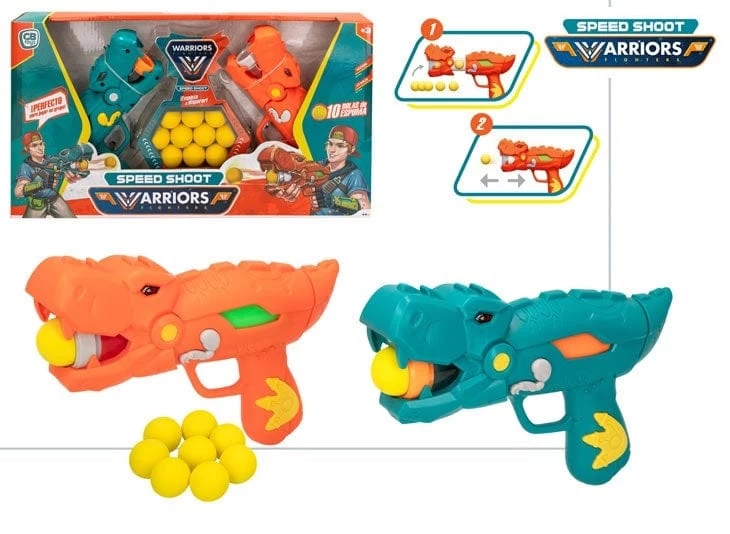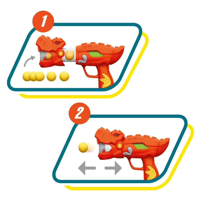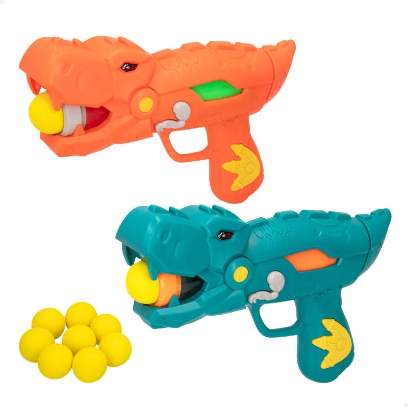 Set 2 Pistole Spara Palline in schiuma a tema Dinosauri. Playset che include due Blaster a Forma di Dinosauro e 10 Palle in Schiuma, Caricamento a Pompa. +3Anni