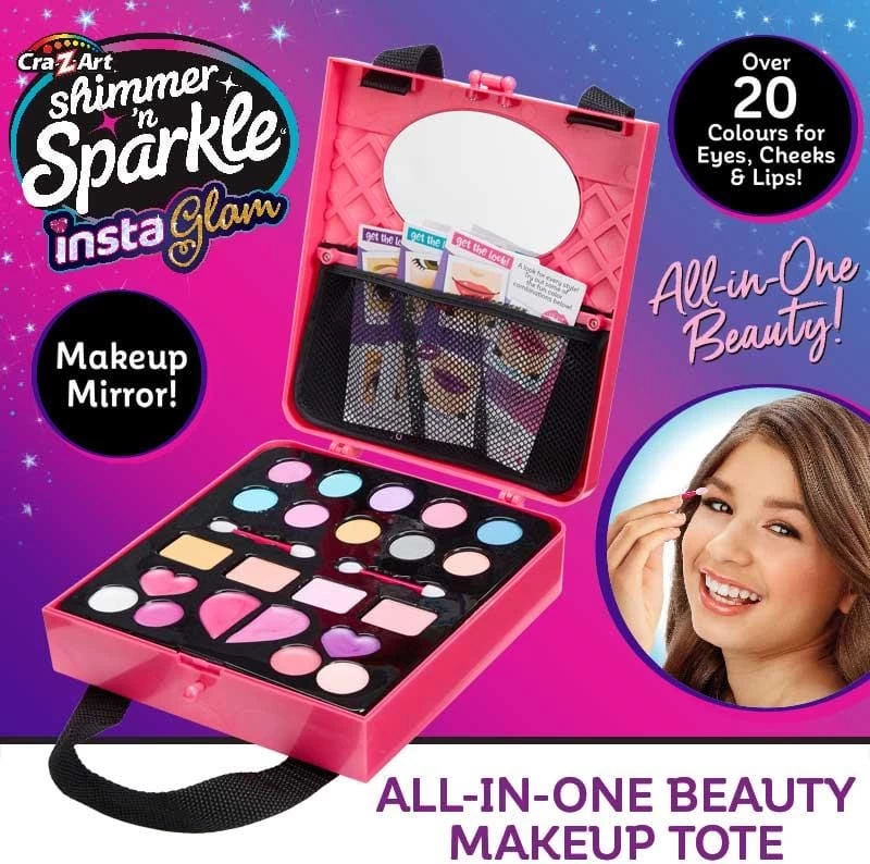 Con la borsetta Trousse per il trucco Shimmer N Sparkle Insta Glam beauty! Ora la tua bambina che ama la bellezza, può diventare una vera truccatrice! The Shimmer and Sparkle tutto in uno Beauty Makeup Total è un vero set di trucchi per bambini, che incoraggia il gioco fantasioso e creativo. Il Beauty Case Trousse include vero trucco e specchio per i bambini per creare il proprio stile di bellezza! Include oltre 20 colori per il trucco di tendenza e gratuiti progettati per creare i look perfetti in movimento: Contiene 10 ombretti, 4 fard e 8 colori per le labbra. Il set include anche applicatori di ombretti per aiutarti ad applicare il trucco come un professionista! Include schede per suggerimenti per il trucco per offrire ispirazione su look cool da creare, che possono essere riposte nelle tasche a rete all’interno del set. La borsa è dotata anche di uno specchio all’interno, così sei sempre pronto ad applicare il tuo trucco in movimento! La borsa può essere chiusa ordinatamente quando hai finito di creare i tuoi look da trucco. Chiudi la borsa e trasportala ovunque con la pratica tracolla. La borsa può essere utilizzata come scatola portaoggetti a casa per riporre tutti i tuoi cosmetici e piccoli oggetti di bellezza all’interno.
